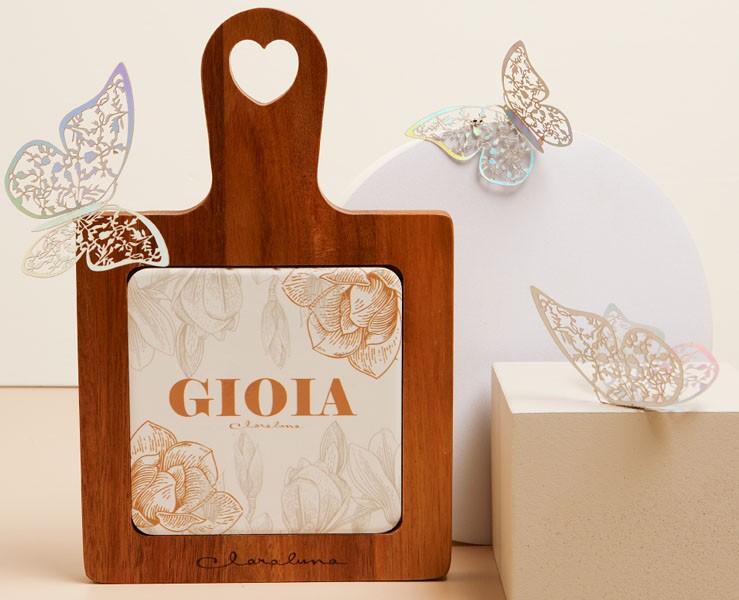Questa elegante bomboniera unisce il calore naturale del legno con la raffinatezza della ceramica decorata, rendendo ogni tavola più accogliente. Il tagliere, di dimensioni 23 x 15 x 1,5 cm, è perfetto non solo come elemento decorativo, ma anche per servire piccoli stuzzichini o per dare un tocco di classe alla cucina. La scritta "Gioia" in rilievo sulla ceramica dona un tocco romantico e unico, ideale per un evento speciale come il matrimonio.