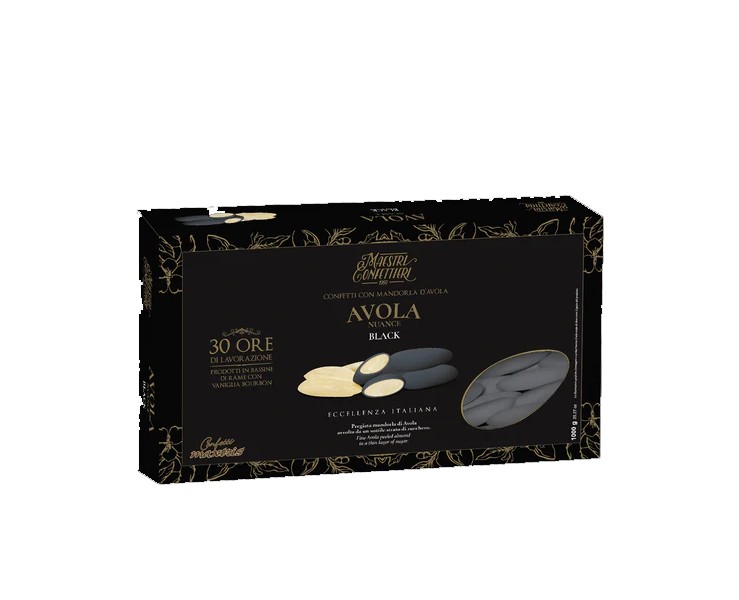 Aggiungi un tocco di raffinatezza alle tue celebrazioni con Avola Nuance Black. Ogni confetto racchiude una pregiata mandorla di Avola, avvolta da un sottilissimo strato di zucchero nero per un piacere unico e irresistibile.