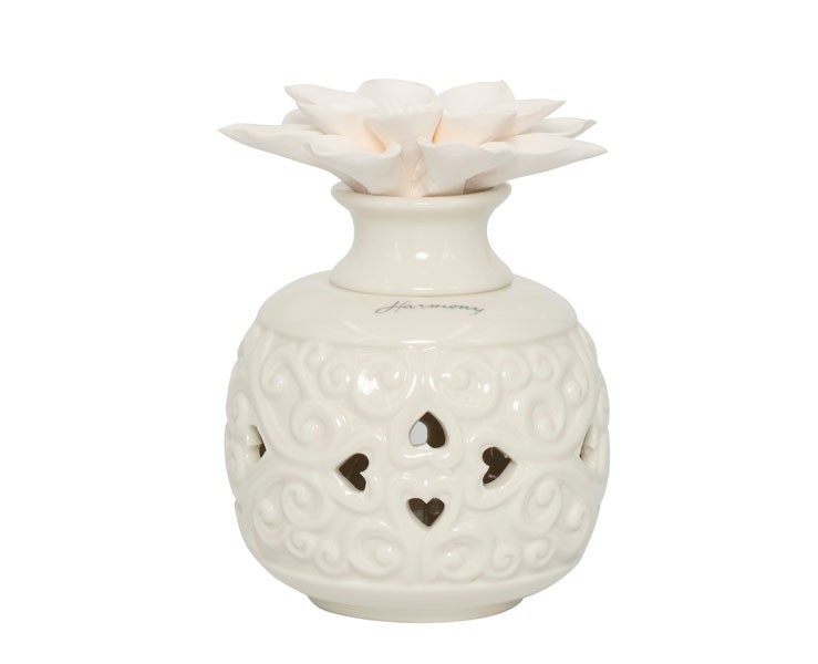 BOMBONIERA MATRIMONIO HARMONY PROFUMATORE PORCELLANA BIANCO CON DECALCO E FIORE GESSO LED