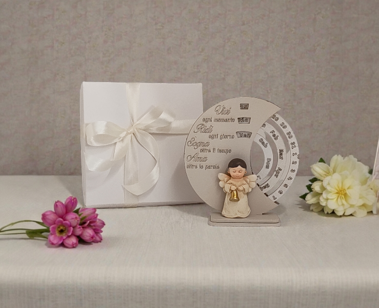 La struttura circolare in legno chiaro permette di aggiornare i giorni e i mesi tramite un sistema di rotazione manuale, rendendolo un oggetto che non scade mai. Sul lato sinistro sono incise quattro dediche poetiche: "Vivi ogni momento", "Ridi ogni giorno", "Sogna oltre il tempo", "Ama oltre le parole". Al centro spicca una tenera statuina in rilievo di un angioletto in preghiera, simbolo di protezione e purezza.