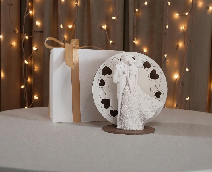 L’elemento centrale è una raffinata statuina bianca in resina che ritrae una coppia di sposi nel momento del loro abbraccio più dolce, posizionata su una base in legno tonalità fango. Sullo sfondo, un disco circolare bianco con intagli a forma di cuore permette alla luce LED integrata di creare giochi d'ombra romantici, mettendo in risalto la silhouette della coppia.