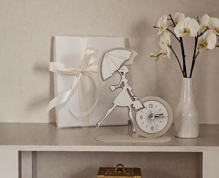 Bomboniera Matrimonio Orologio da Tavolo Donna con Ombrello in Legno