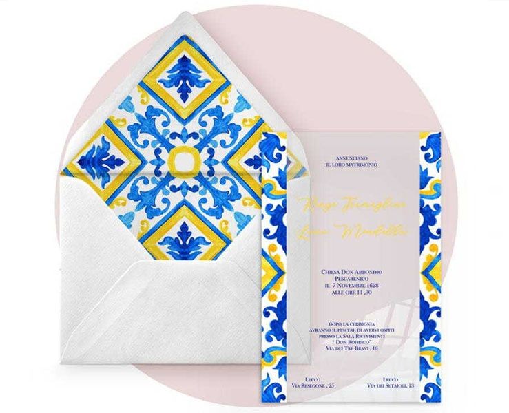 Partecipazione di nozze in plexiglass trasparente rettangolare tema maioliche blu e gialle
