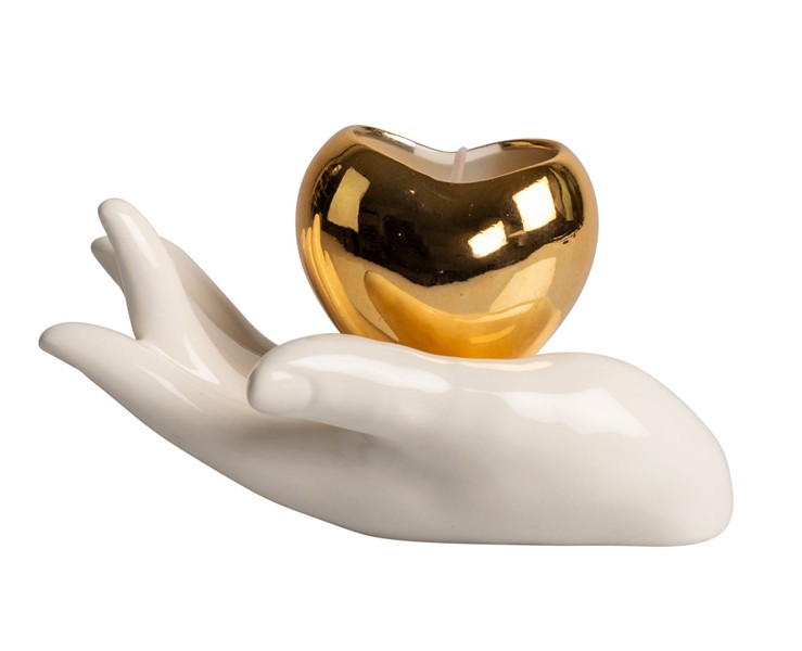 Candela Cuore Dorato su Mano in Porcellana Bianca