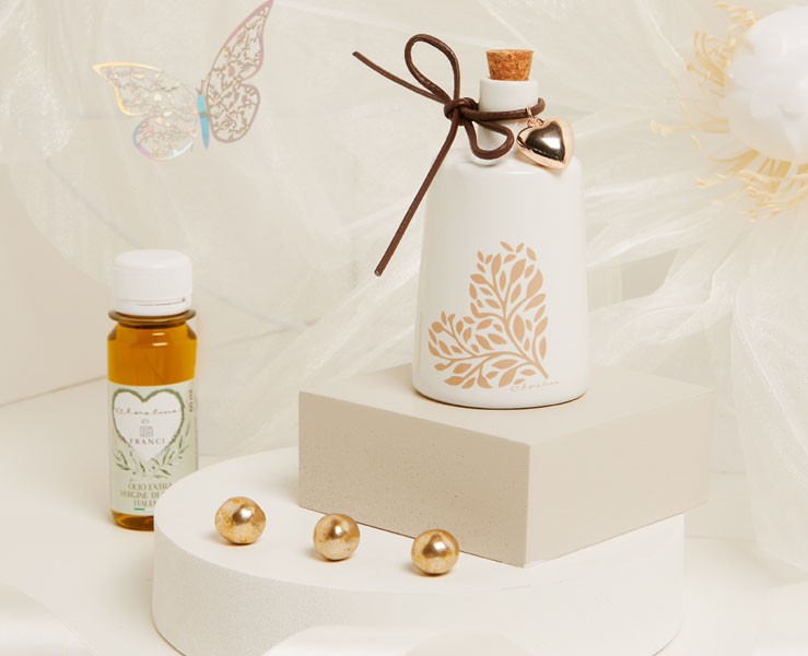 La collezione Claraluna 2025 propone una bomboniera che unisce funzionalità e raffinatezza: l'oliera grande a forma di cuore in porcellana, impreziosita da una bottiglietta di olio extra vergine d'oliva da 60 ml. Questo oggetto, dal design romantico e delicato, è perfetto per chi desidera regalare un ricordo utile e di valore durante matrimoni, anniversari o altre ricorrenze speciali