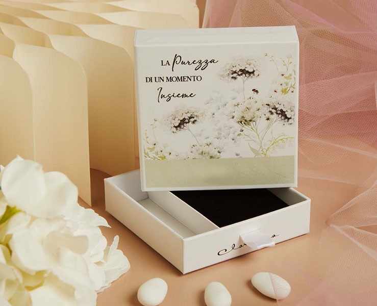 Messaggio Poietico: Il coperchio reca la frase "LA PUREZZA DI UN MOMENTO INSIEME" (o simile), rafforzando il significato affettivo della bomboniera.