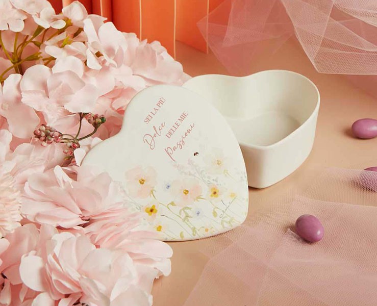 La collezione Claraluna 2026 racconta la tenerezza dei momenti speciali con questa splendida scatola a cuore in porcellana bianca, dalle dimensioni di 12x12x4,5 cm, decorata con un raffinato motivo floreale rosa e la frase romantica “Sei la più dolce delle mie passioni”.