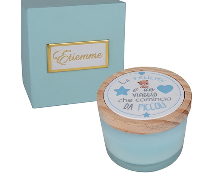 Il contenitore è realizzato in vetro satinato di un raffinato color azzurro polvere, che diffonde la luce della fiamma in modo morbido e rassicurante. Il vero dettaglio di stile è il tappo in legno chiaro, che funge anche da base o protezione, sul quale è applicata un'illustrazione dolcissima: un piccolo orsetto circondato da stelle e cuori azzurri, insieme alla dedica ispirazionale: "La felicità è un viaggio che comincia da piccoli".