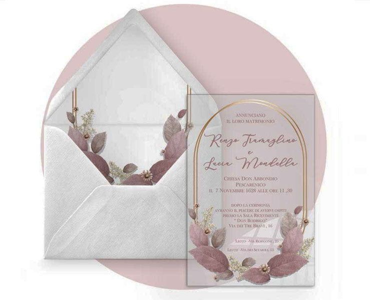 Inviti per matrimonio in plexiglass trasparente rettangolare, stampa del testo a colori e foglie color rosa antico e bianco coprente, fornita senza busta, formato cm 11,5x16,8; minimo d'ordine 35 pz, possibilità di acquistare busta ed internobusta abbinato.