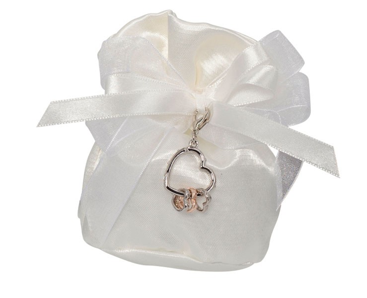 POCHETTE RASO BIANCA CON CHARM CUORE STRASS + 3 CUORI ORO RAME SILVER