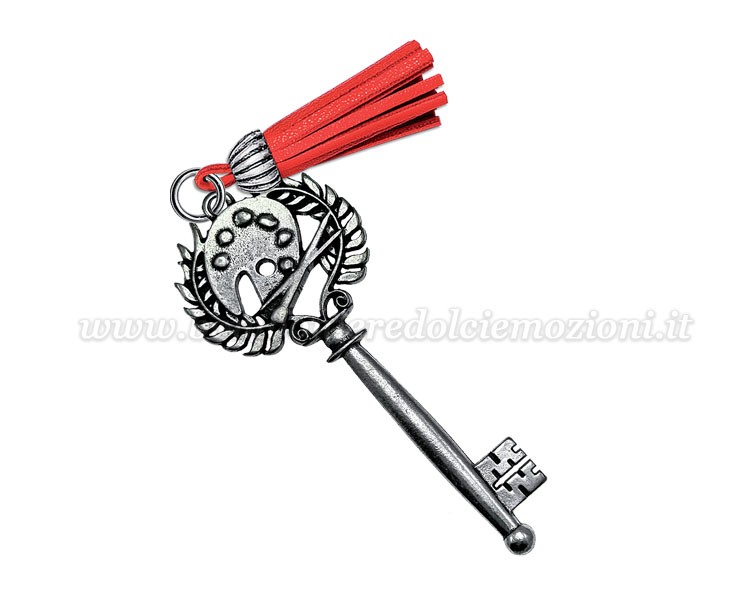 Celebra il tuo traguardo accademico con questa elegante bomboniera per laurea, raffigurante una chiave decorata consimbolo arte. Questo ciondolo rappresenta la creatività, l'estetica e l'espressione artistica, rendendolo perfetto per celebrare il traguardo accademico di chi si dedica alle discipline legate all'arte e al design. Realizzata in metallo di alta qualità, ricoperto in argento e rifinita a mano, questa miniatura è un autentico capolavoro artigianale Made in Italy. La nappina rossa, simbolo tradizionale di laurea, aggiunge un tocco di colore e significato. Misura circa 8,5 cm di altezza, ideale come dono raffinato e prezioso.