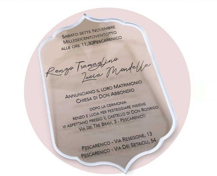 nviti per matrimonio in plexiglass trasparente rettangolare, stampa di testo e motivi floreali a colori e bianco coprente, fornita senza busta, formato cm 11,5x16,8; minimo d'ordine 35 pz possibilità di acquistare busta ed internobusta abbinato.