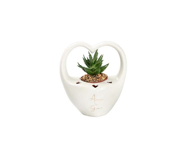Bomboniera Matrimonio harmony PORTA PIANTINA PORCELLANA BIANCA CON MANICO CUORE CON PIANTA INCLUSA