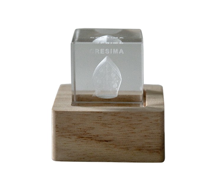 Base in Legno Naturale: Il cubo poggia su un elegante supporto in legno chiaro, creando un contrasto materico raffinato e moderno.