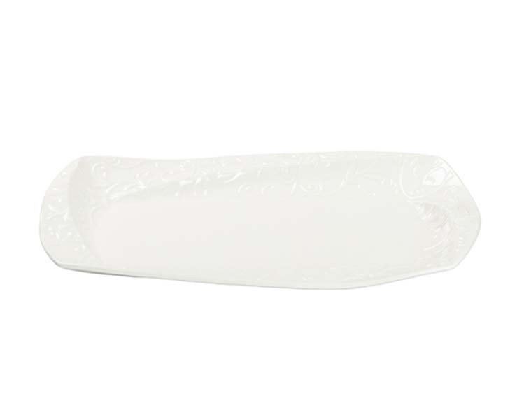 Lavorazione a Rilievo "Alice": L'intero perimetro e il fondo del vassoio sono decorati con motivi floreali e volute in rilievo, percepibili al tatto, che esaltano la lucentezza della porcellana.
