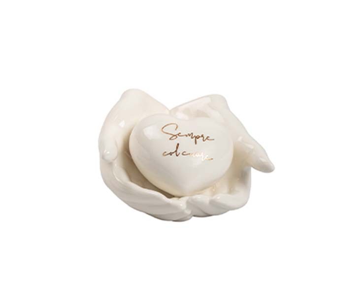 Bomboniera Matrimonio harmony MANI PORCELLANA CON CUORE BIANCO CON 2 FRASI ASSORTITI CON BOX E SACCHETTO