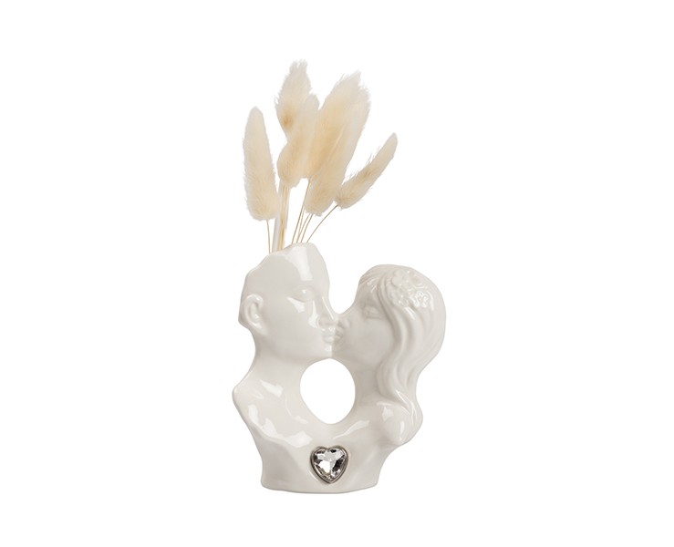 Bomboniera Matrimonio harmony PROFUMATORE COPPIA PORCELLANA BIANCA CON CUORE CRISTALLO, PAMPAS, BOX E SACCHETTO