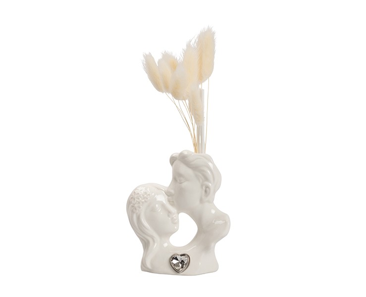 Bomboniera Matrimonio harmony PROFUMATORE COPPIA BACIO SULLA FRONTE PORCELLANA BIANCA CON CUORE CRISTALLO, PAMPAS, BOX E SACC