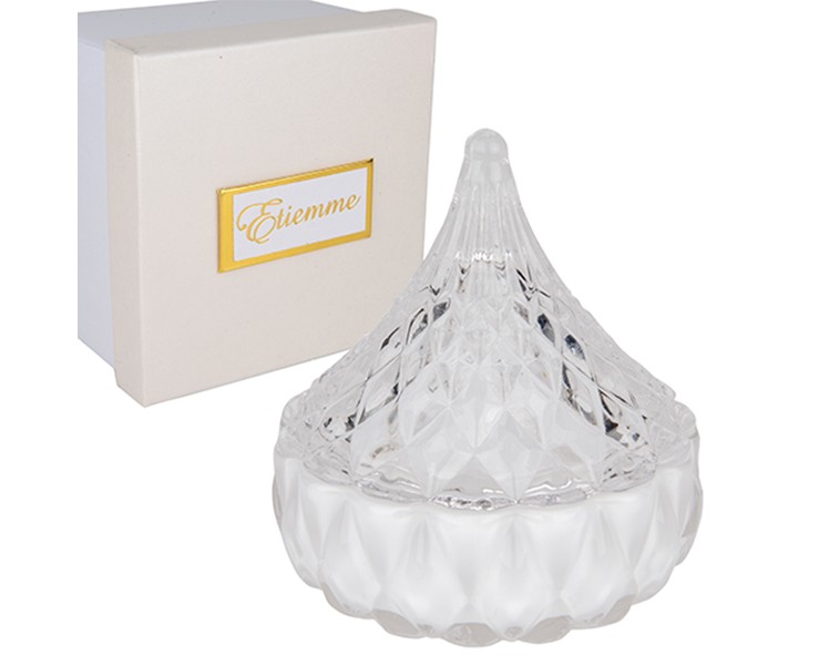 Il corpo della scatola è realizzato in cristallo trasparente di alta qualità, caratterizzato da una complessa lavorazione a intaglio geometrico che crea riflessi brillanti in ogni sfaccettatura. La base bombata si restringe elegantemente verso l'alto, culminando in un coperchio a piramide con una punta liscia che ne facilita l'apertura. La purezza del materiale e la precisione dei decori rendono questo portagioie un pezzo d'arredo perfetto per tavoli da toeletta, scrivanie o vetrine ricercate.