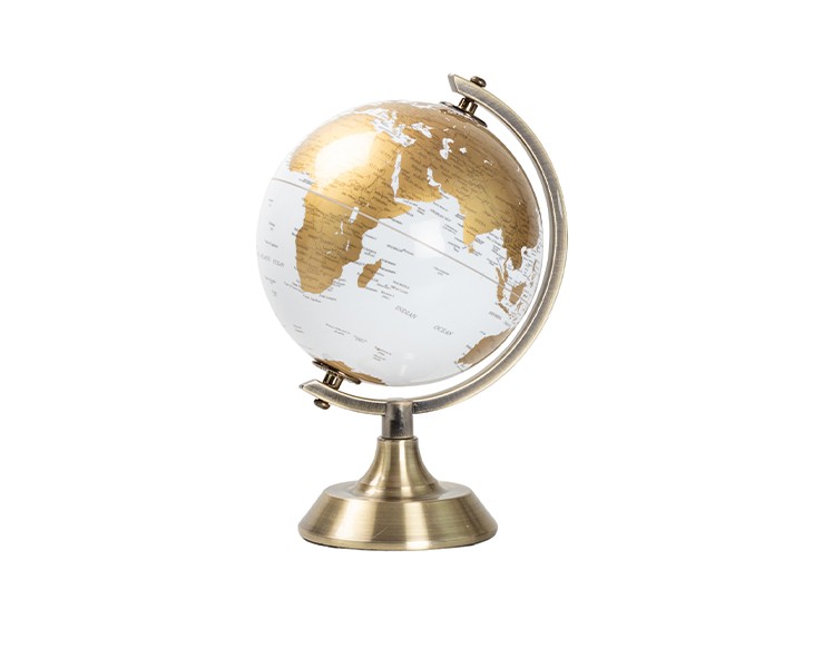Cartografia Prestigiosa: Il globo presenta una mappa dettagliata dove le terre emerse risplendono in oro, creando un contrasto sofisticato con il fondo avorio neutro.