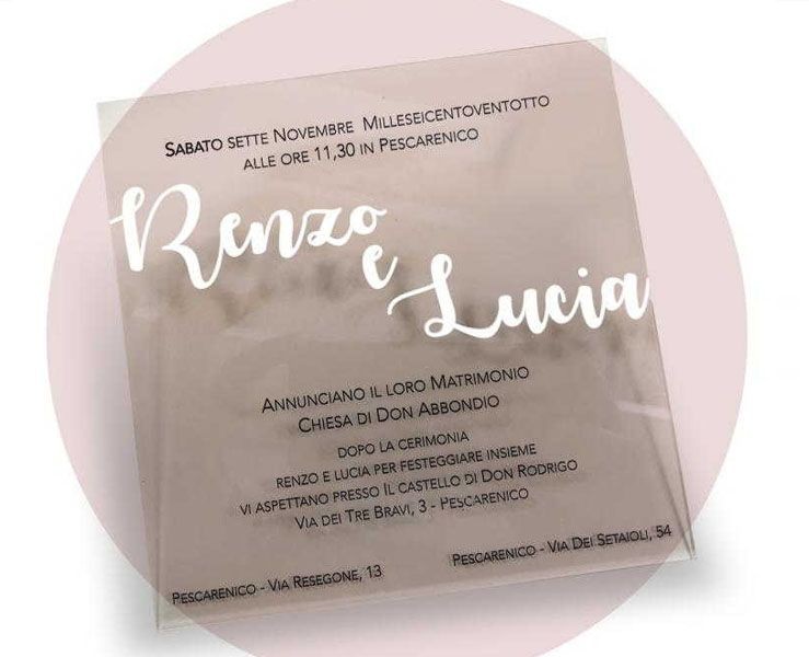 Inviti per matrimonio in plexiglass trasparente quadrato, stampa a colori e bianco coprente, fornita senza busta, formato cm 15x15; minimo d'ordine 35 pz.