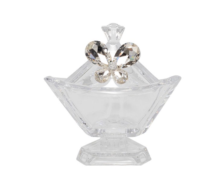 BOMBONIERA MATRIMONIO HARMONY SCATOLA TRIANGOLARE CON PIEDE VETRO CON APPL. FARFALLA CRISTALLO