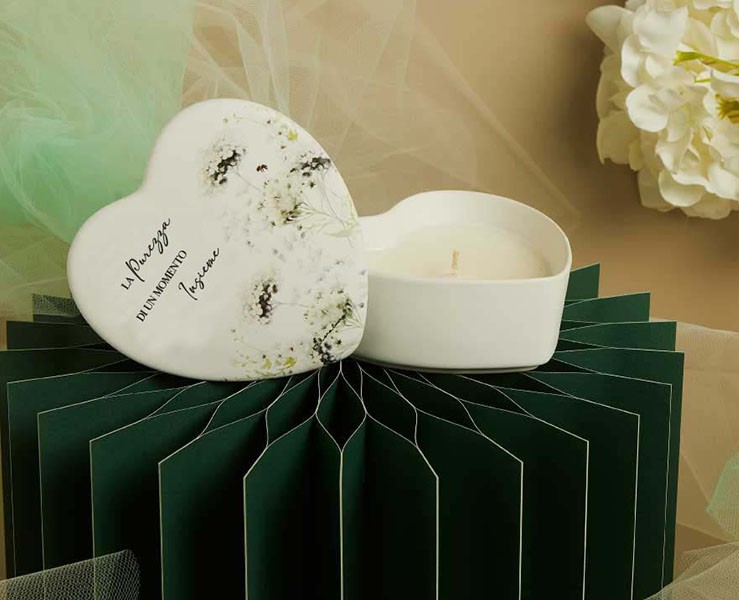 Bomboniera Claraluna scatola cuore con candela decoro floreale verde