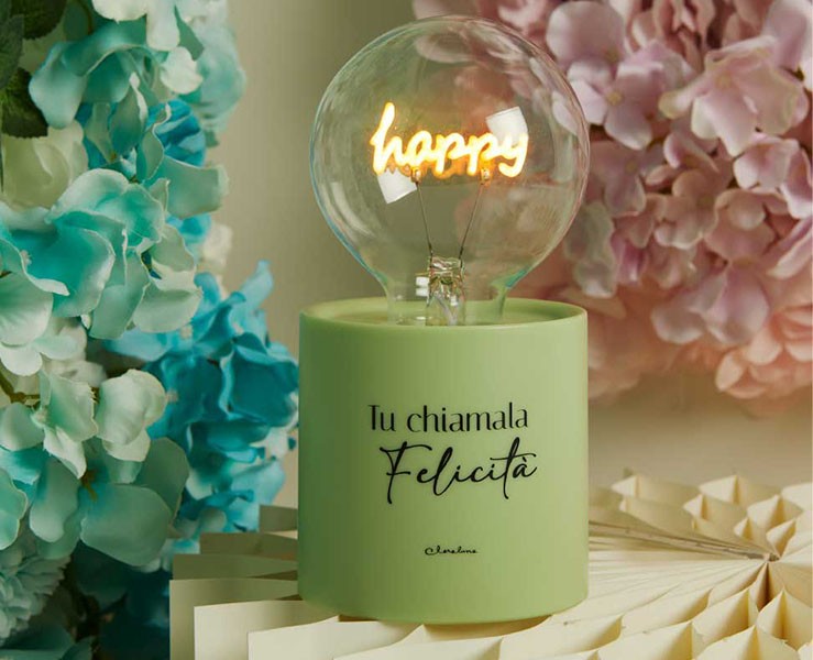 La lampadina trasparente contiene un filamento luminoso che disegna la parola “happy”, un messaggio semplice e potente che illumina lo spazio e l’anima di chi la riceve. Sulla base, la frase “Tu chiamala Felicità” completa l’opera trasformando questa lampada in un simbolo di gioia quotidiana.