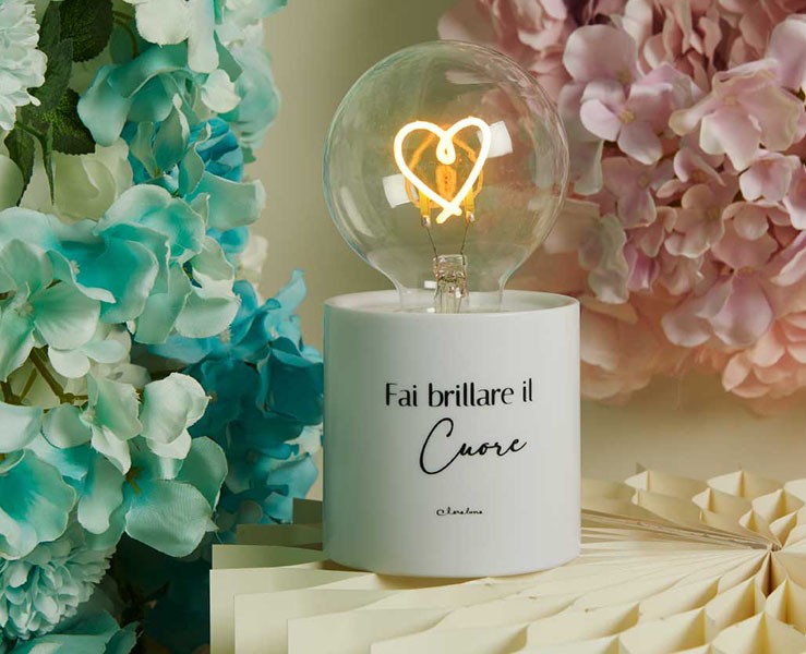 La Lampada LED Bianca Claraluna è molto più di un semplice punto luce: è un messaggio d’amore che illumina ogni spazio con poesia. La sua struttura minimal in ceramica bianca, decorata con la frase “Fai brillare il cuore”, accoglie una splendida lampadina con filamento sagomato a cuore luminoso, creando un effetto caldo, emozionante e scenografico.