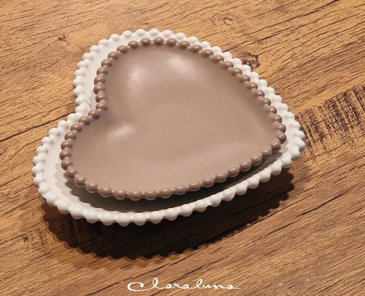 Bomboniera Matrimonio Claraluna bis piattini cuore marrone medio e bianco grande