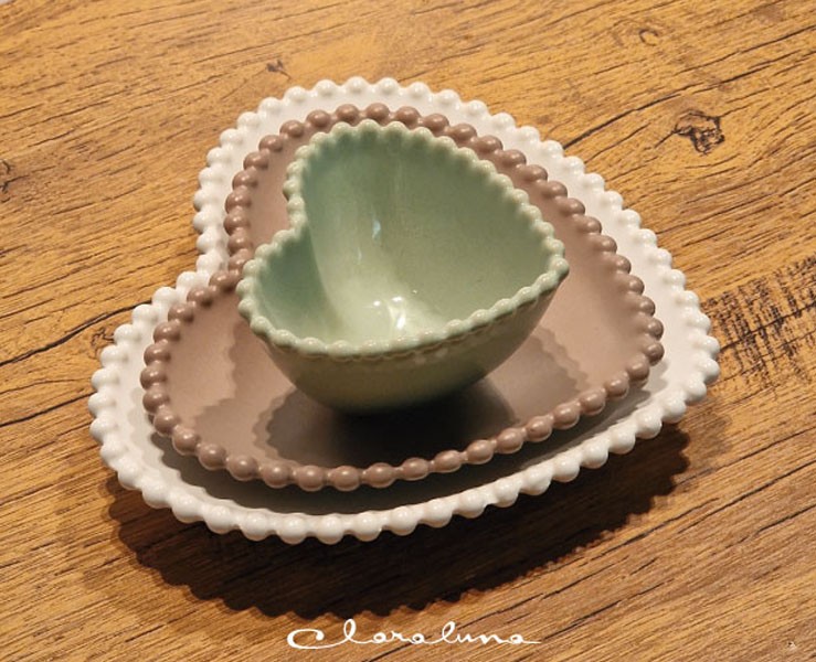 Bomboniera Matrimonio Claraluna tris piattini cuore verde piccolo marrone medio bianco grande