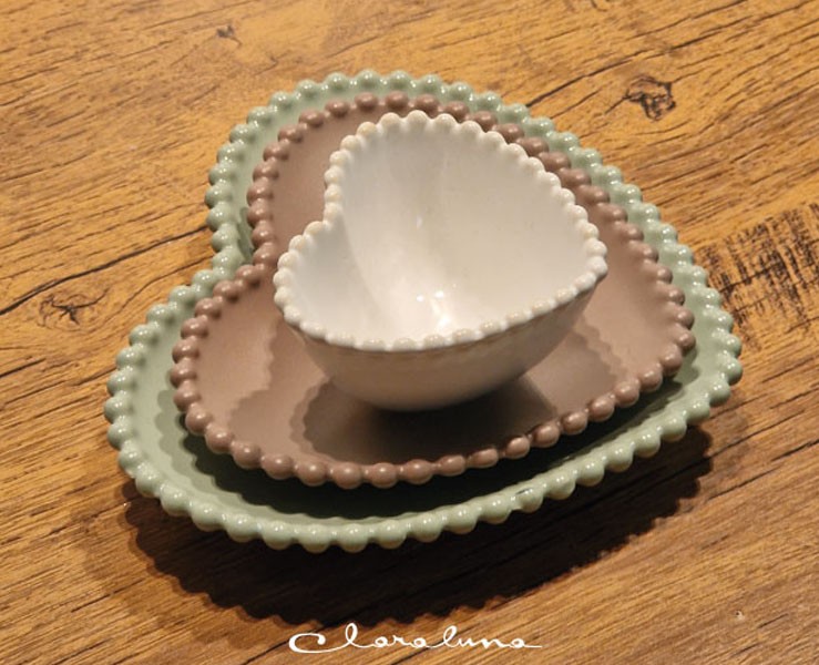 Bomboniera Matrimonio Claraluna tris piattini cuore bianco piccolo marrone medio verde grande