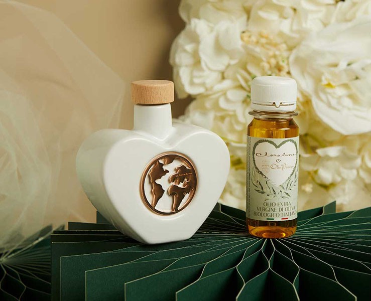 Bomboniera Matrimonio Claraluna 2026 Oliera Cuore con Mondo Oro Rosa con olio
