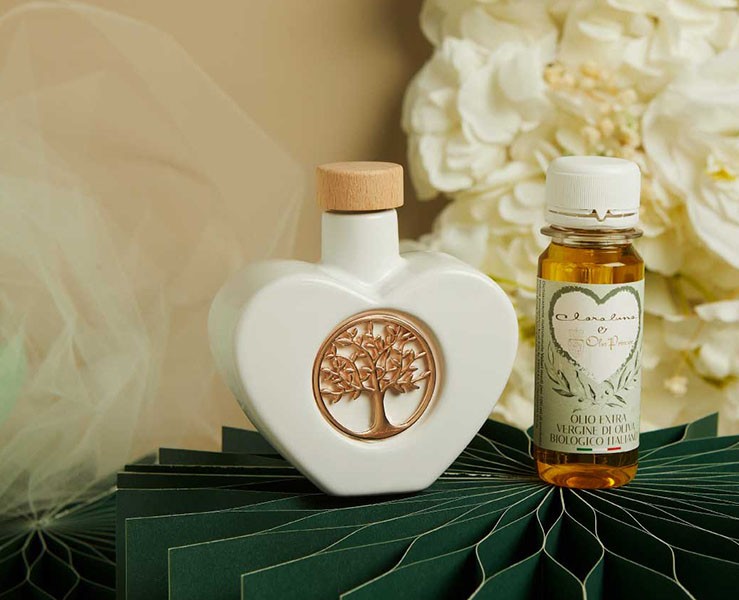 Bomboniera Matrimonio Claraluna 2026 Oliera Cuore con Albero della Vita Oro Rosa con olio