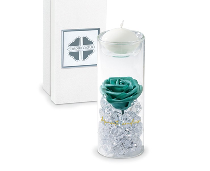 Eccellenza Artigianale e Design: La struttura consiste in un cilindro di vetro trasparente alto 16 cm, che protegge ed esalta una rosa artigianale in una profonda tonalità verde smeraldo. Il fiore poggia su una base di cristalli acrilici sfaccettati che creano scenografici riflessi luminosi. Sul fronte del vetro risalta la raffinata incisione in oro "Momenti condivisi", che trasforma la bomboniera in un messaggio emozionale per i tuoi ospiti. La sommità del tubo è predisposta per accogliere una candela tea-light (inclusa), rendendo l'oggetto una versatile lampada d'atmosfera.