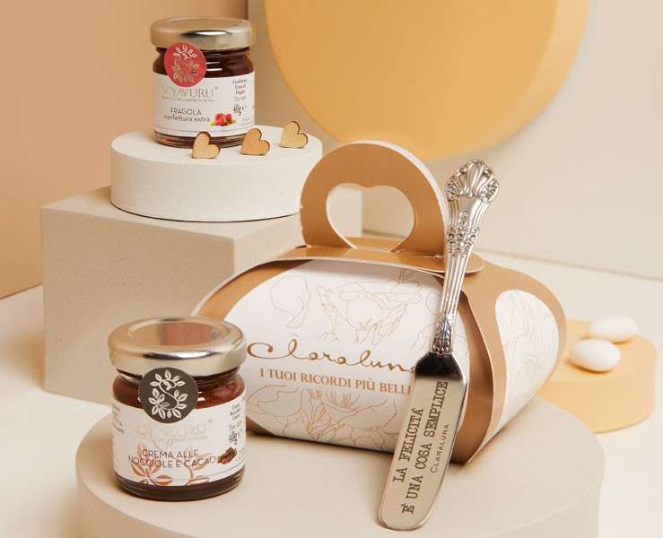 Bomboniera Claraluna con Marmellata Frutti di bosco, Crema Nocciola e Coltellino