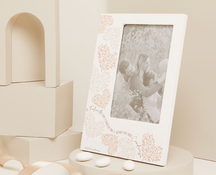 Elegante portafoto in legno firmato Claraluna, con un delicato decoro floreale rosa che avvolge il bordo, donando un tocco romantico e raffinato. Le dimensioni generose di 15x21 cm permettono di esporre una foto importante, rendendo questo portafoto ideale per celebrare momenti speciali come matrimoni, battesimi, anniversari e comunioni. La struttura in legno conferisce solidità e durevolezza, garantendo che i tuoi ricordi siano esposti in maniera elegante e sofisticata.
