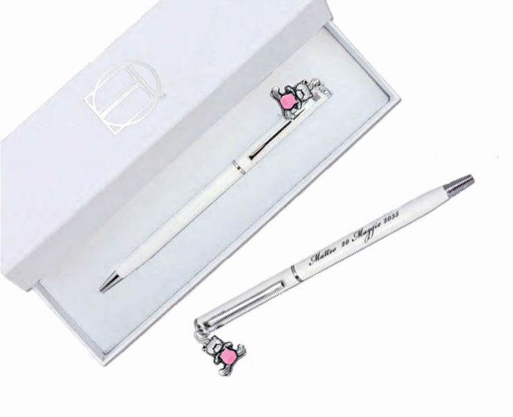 bomboniere Tabor nascita e battesimo penna bianca personalizzata con ciondolo orso smaltato rosa