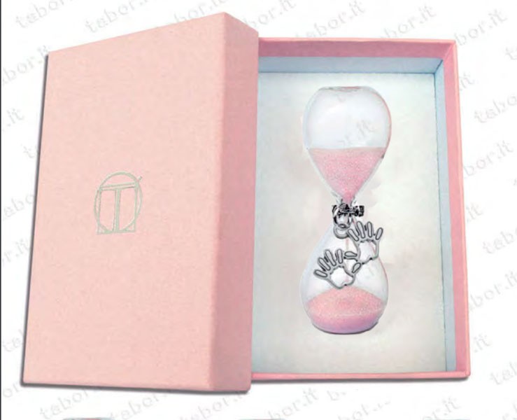 Bomboniera Battesimo Tabor clessidra rosa con ciondolo manine