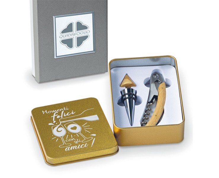 Eccellenza Artigianale e Design: Il set è composto da due accessori indispensabili per ogni intenditore di vini: un cavatappi professionale con doppia leva e un tappo versatore con guarnizione ermetica per preservare al meglio le proprietà organolettiche delle bottiglie aperte. Entrambi gli strumenti presentano finiture in legno naturale e acciaio inossidabile di alta qualità. Il tutto è presentato in una moderna scatola di metallo color rame satinato, il cui coperchio è decorato con l'illustrazione di due calici che brindano e la frase: "Momenti felici con gli amici!". La scatola (10x13 cm) funge da custodia permanente, garantendo ordine e prestigio.