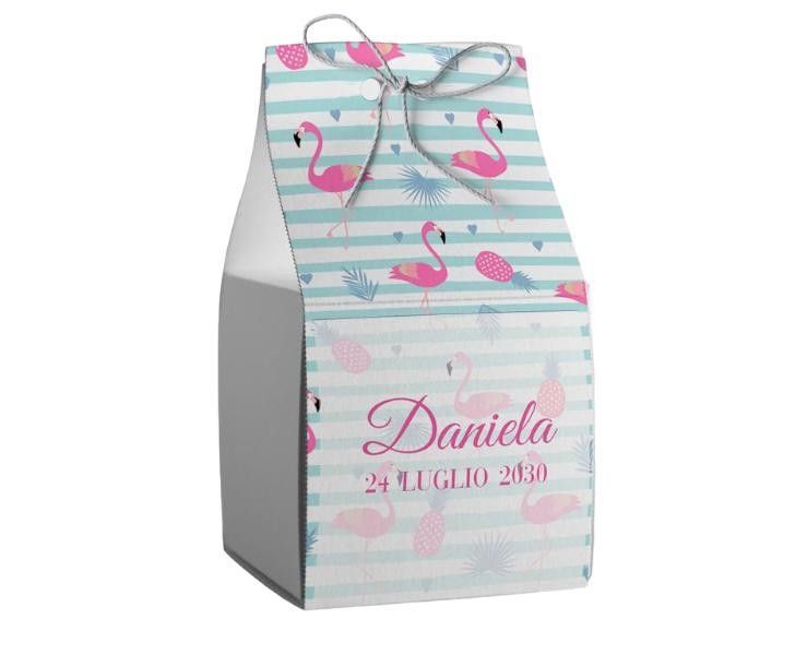 Scatolina porta confetti personalizzata quadrata bianca con strisce blu e fenicotteri