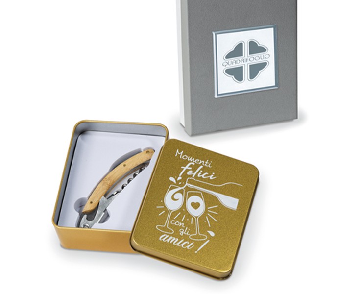 Bomboniera Solidale Cavatappi Professionale in Scatola di Metallo Rame Quadrifoglio per Fondazione ABIO