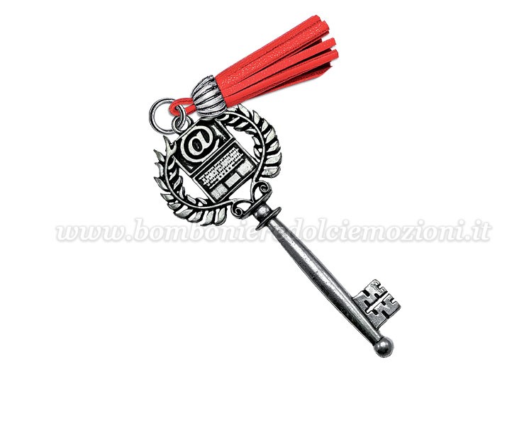 Celebra il tuo traguardo accademico con questa elegante bomboniera per laurea, raffigurante una chiave decorata concomputer, simbolo di conoscenza e precisione. Realizzata in metallo di alta qualità, ricoperto in argento e rifinita a mano, questa miniatura è un autentico capolavoro artigianale Made in Italy. La nappina rossa, simbolo tradizionale di laurea, aggiunge un tocco di colore e significato. Misura circa 8,5 cm di altezza, ideale come dono raffinato e prezioso.