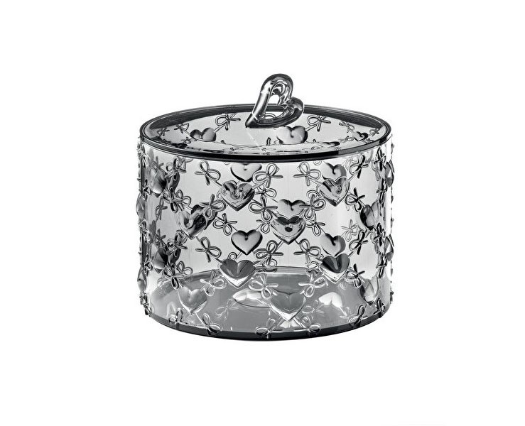 Contenitori con coperchio capaci di trasferire tutto il senso della preziosità di un sentimento così importante come l'amore: dei veri e propri scrigni fatti per contenere raffinate prelibatezze. Realizzati in materiale acrilico pregiato trasparente colorato ripropongono un decoro in rilevo fatto di piccoli cuori e delicati nodi d’amore che si rincorrono su tutta la superficie