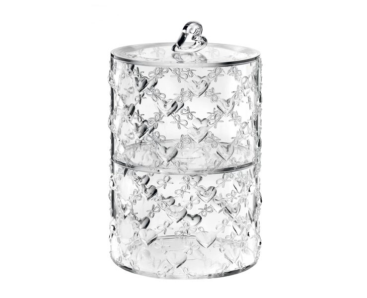 Contenitori impilabili capaci di trasferire tutto il senso della preziosità di un sentimento così importante come l'amore: dei veri e propri scrigni fatti per contenere raffinate prelibatezze. Realizzati in materiale acrilico pregiato trasparente colorato ripropongono un decoro in rilevo fatto di piccoli cuori e delicati nodi d’amore che si rincorrono su tutta la superficie