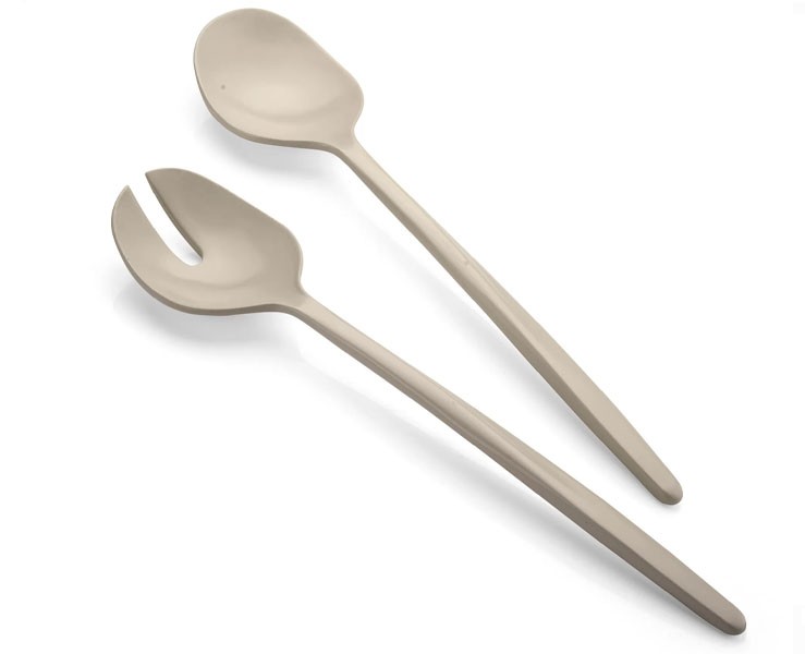 Posate per insalata della collezione Tierra realizzate riciclando 2,6 bottiglie d'acqua in PET da post consumo, L'attenta selezione di cromie propone una tavola ispirata al calore della terra e contribuisce ad avvicinare questa collezione alla natura.