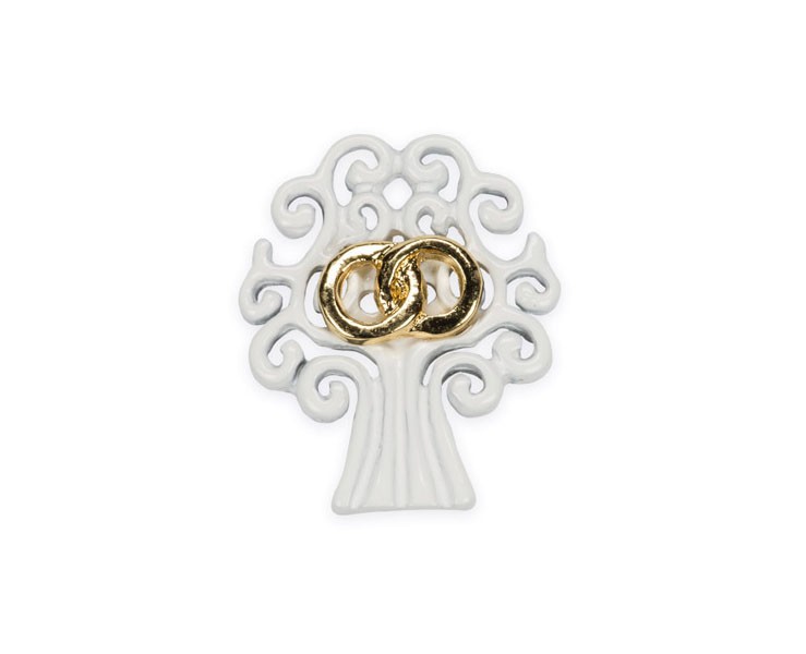 L'applicazione Albero della Vita con fedi oro è la scelta d'eccellenza per chi desidera una bomboniera che comunichi immediatamente il tema dell'amore coniugale. Il richiamo all'oro la rende particolarmente indicata per il 50° anniversario di matrimonio, ma la sua delicatezza la rende perfetta anche per il giorno del "Sì". È un dettaglio che trasforma un semplice porta confetti in un ricordo carico di significato spirituale e affettivo.
