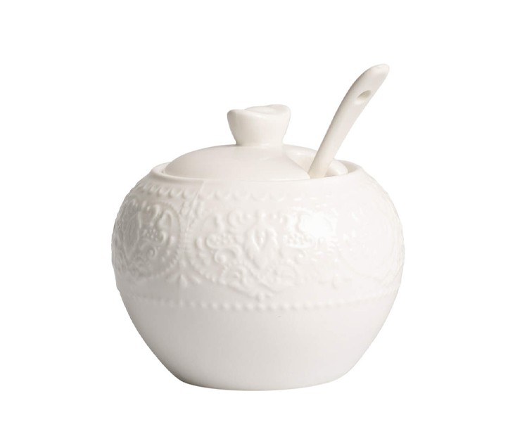 Un’elegante zuccheriera della linea "Alice" di Harmony, realizzata in porcellana bianca con delicato motivo a decalco. Completa di coperchio e cucchiaio coordinati, è una scelta raffinata e funzionale per la tua tavola, ideale come bomboniera per matrimoni, anniversari e altre occasioni speciali.
