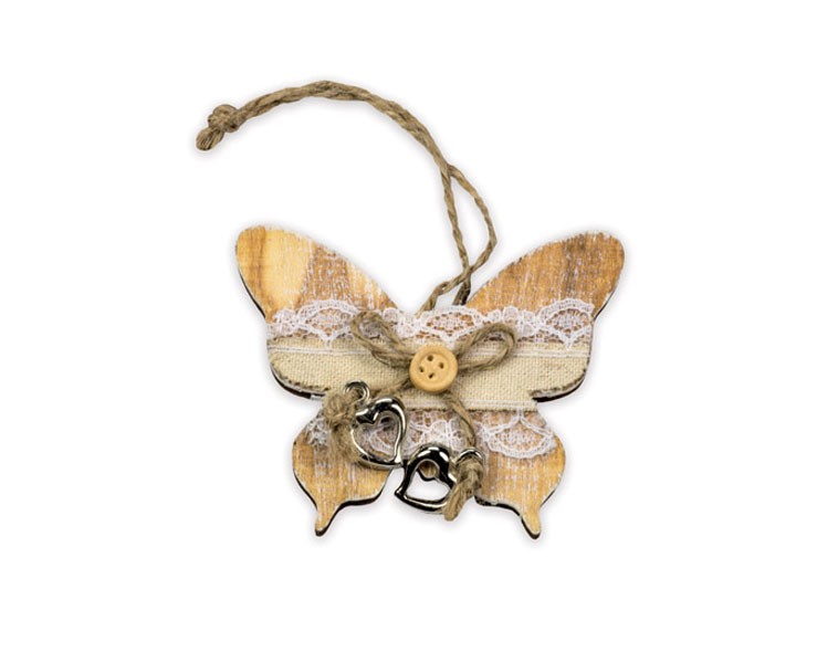 Base in Legno Naturale: L'applicazione presenta una sagoma a forma di farfalla realizzata in legno con una finitura sbiancata "effetto vissuto", che mette in risalto le venature naturali del materiale.