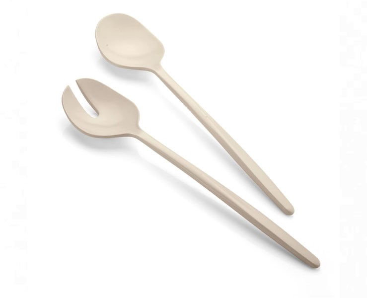 Posate per insalata della collezione Tierra realizzate riciclando 2,6 bottiglie d'acqua in PET da post consumo, L'attenta selezione di cromie propone una tavola ispirata al calore della terra e contribuisce ad avvicinare questa collezione alla natura.